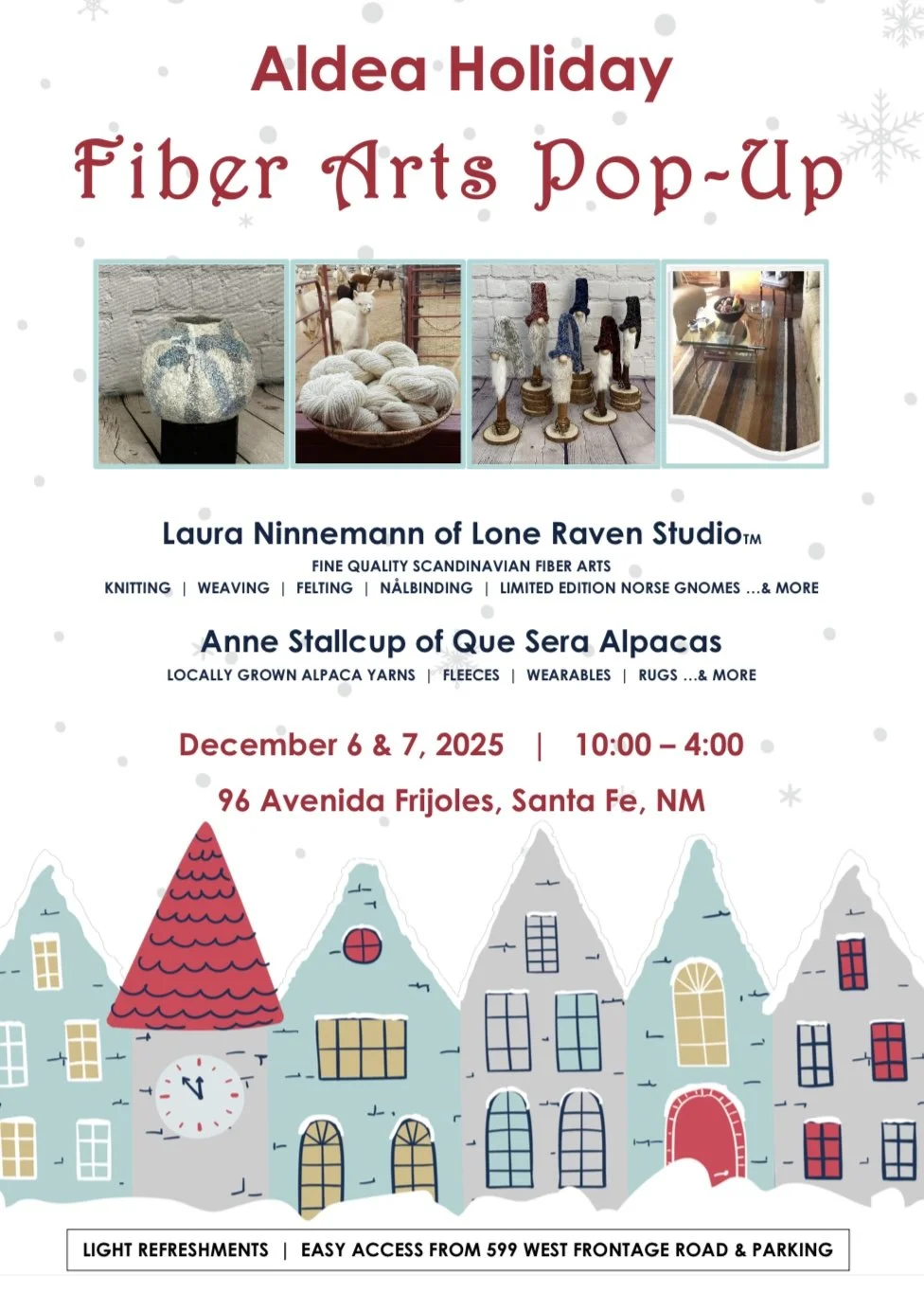 This festive event features the work of Laura Ninnemann of Lone Raven Studio, known for her fine quality Scandinavian fiber arts - including knitting, weaving, felting, nalbinding, and her original limited-edition Norse gnomes - along with Anne Stallcup of Que Sera Alpacas, offering locally-grown alpaca yarns, fleeces, wearables, and rugs. Come explore handcrafted treasures, meet the artists, enjoy demonstrations, and find the perfect holiday gifts while supporting local makers and sustainable fiber traditions.
